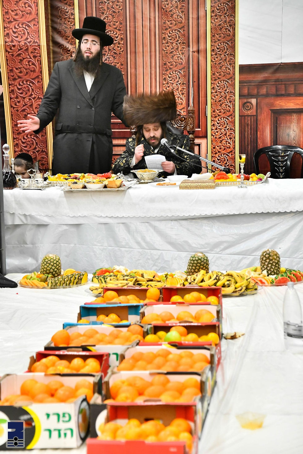 דער רבי שליט"א איז ערשינען צום טיש מלובש מיט בגדי שבת כמנהג אבותיו הקדושים, דער טיש האט זיך פארצויגן פאר ארום דריי און א האלב שעה, באגלייט מיט כלי שיר וזמר, וואו מאסן אידן האבן מיטגעלעבט די געהויבענע שעות של שמחה ודביקות, ווען בין גברא לגברא איז דער רבי משמיע מצוף נועם אמרותיו, נאכן בענטשן זענען די הונדערטער באטייליגטע דורכגעגאנגען פארנט פונעם רבי'ן שליט"א וועלכע האט פארטיילט פירות פאר אלע משתתפים.