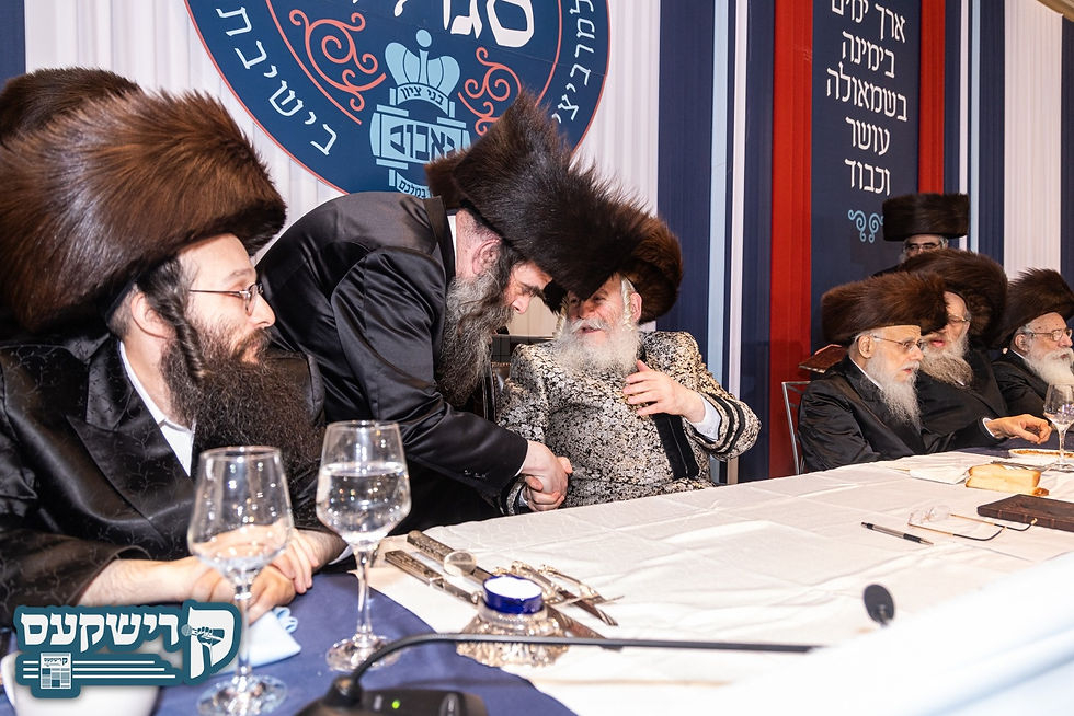 פילע אדמור"ים ורבנים סביב לשולחן איידערן ערשיינען צום גראנדיעזן מעמד הסיום דורך מפעל "שיננא" היינטיגן ליל שישי אין ירושלים.