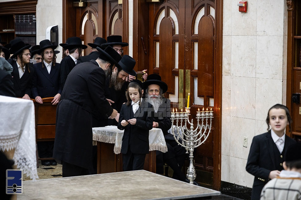 צום באשטימטן שעה איז דער רב שליט"א ערשינען בהיכל ביהמ"ד הגדול בדחילו ורחימו, צוגעגרייט די מנורה און געצינדן די נרות חנוכה, וואס איז מיטגעהאלטן געווארן דורך כל העדה הקדושה בפרסומי דניסא.