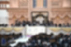 ארום פינף אזייגער נאכמיטאג, עת כי פנה יום, זענען די אדמורי"ם שליט"א ערשינען אינאיינעם אין ביהמ"ד הגדול לקול תרועת הזמר בשמחה וצהלה דורך די טויזנטער חסידים וועלכע האבן איבערגעפילט דעם ריזן היכל על כל גדותיו, נישט וועלנדיג פארפאסטן דעם געהויבענעם זמן.